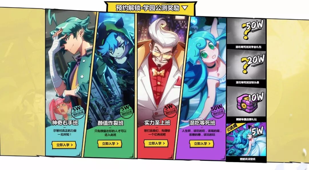 通过这个入口,我们可以看到,目前学园里分成了四个大班级,分别是神奇右手班、颜值炸裂班、实力至上班和混吃等死班,分别对应四类游戏礼包。班级人数越多,可以解锁的奖励越大!