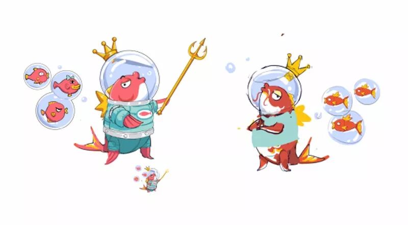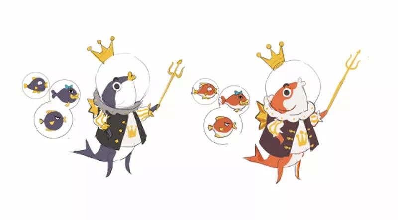 在确定了这个角色的基础形象之后,老王带着这份方案参加了一次概念讨论会,不出所料,大家都非常喜欢这个别具特色的咸鱼王,原画师大佬阿翔也表示对此很有创作欲望。