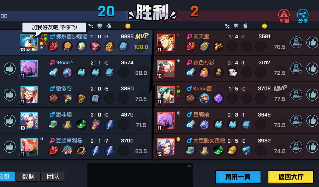 现在完成战场之后,可以在结算界面右下角找到 【再来一局】 按钮,点击后即可号召 当前的队友 一起快速进入匹配,再也不需要回到主城戳戳戳啦!