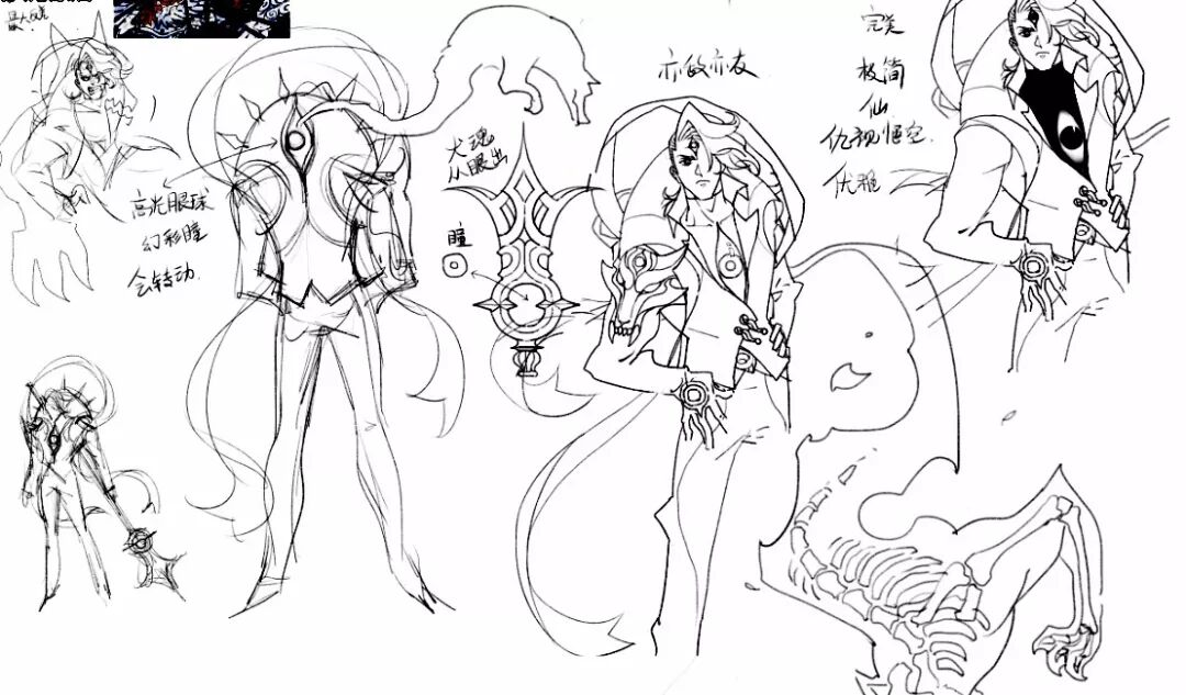 最初给他的梗是:坚决不正眼看人的帅家伙,能用一只眼看不用两只,能用两只不用三只。 因此,美术组就根据这样的设定,画出了如下的草图: