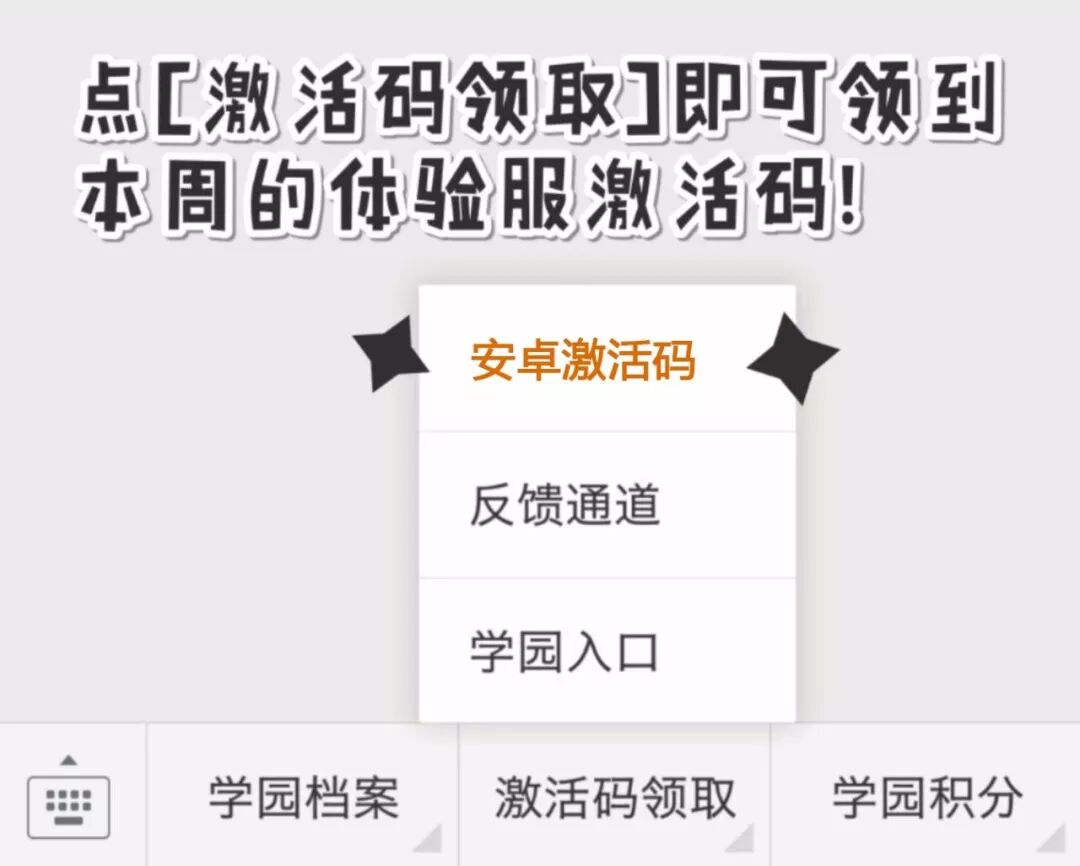② 微信领取: 进入官方微信公众号,点击菜单【激活码领取】-【安卓激活码】,即可获得激活码一枚。 微信激活码现已开始发放 ,先到先得。