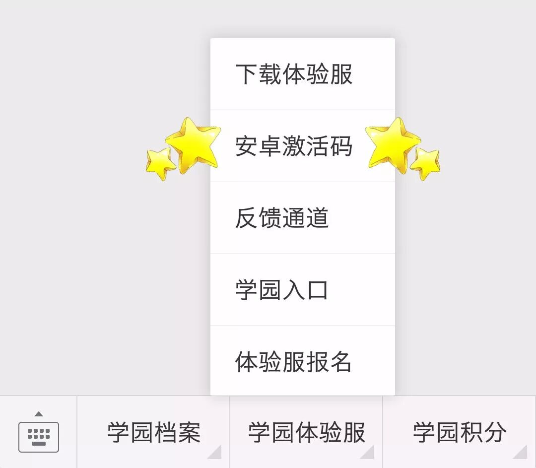 ② 微信领取: 进入官方微信公众号,点击菜单【学园体验服】-【安卓激活码】,即可获得激活码一枚。 微信激活码现已开始发放 ,先到先得。