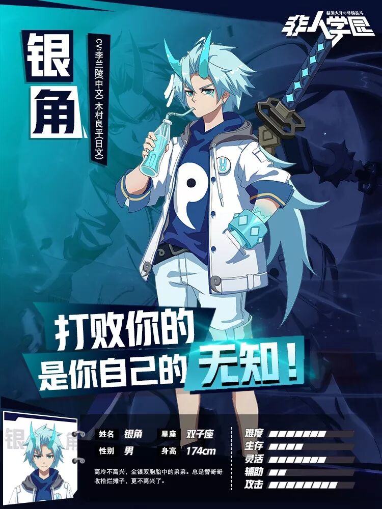 银角: 男, 17岁,身高174cm,双子座,天赋高级中学学生。 金角的双胞胎弟弟,善于思考,像冰一般拥有冷静的头脑,智商高达200。