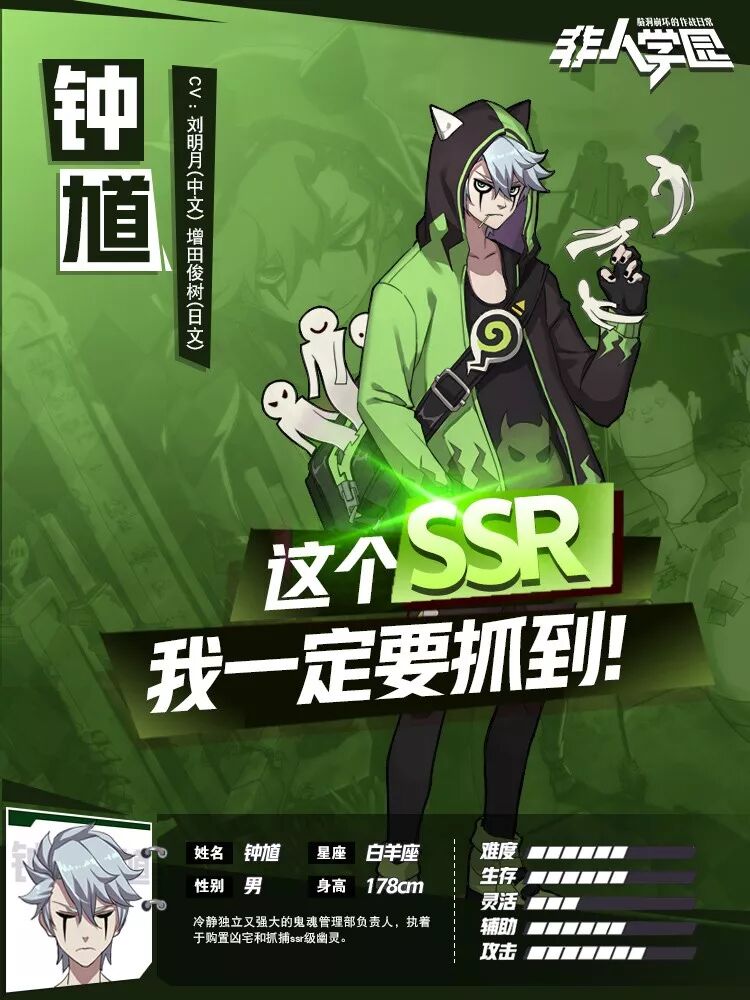 冷酷无情(隐性傲娇),独立纯粹。 在游乐园的鬼屋打工,里面的鬼怪都是被抓来做义务劳动的幽灵。 喜欢SSR幽灵、鬼屋和灵异事件相关的事情,非常讨厌并不恐怖的恐怖片…… (此处的字迹十分潦草,戛然而止,可能是记录者被幽灵吓坏了。)