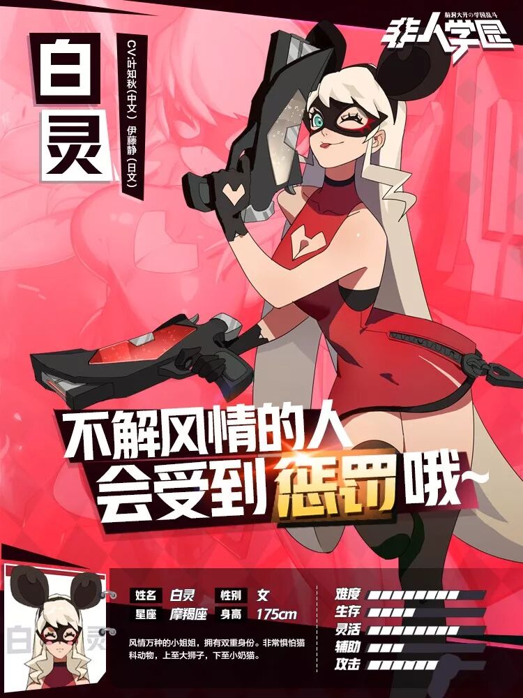 白灵: 女,24 岁,身高175cm,摩羯座,三中舞蹈教师。 白天,她是学园里最美丽的舞蹈老师,男生都将她作为梦中情人,她的课是学园里最热门的课程。夜晚,她是神秘的怪盗女王,游走于高楼之间。