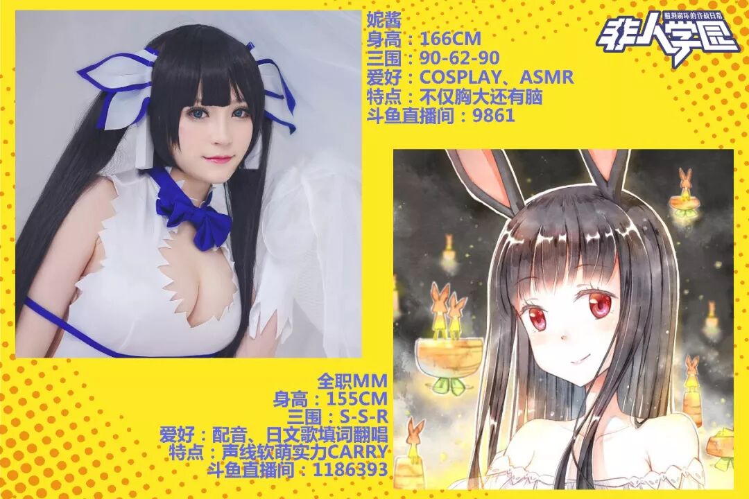 当然,除了神龙妹子团的强势加入,说好的“一大波萌妹”也是必须要有的!这次《非人学园》的直播活动,还特别邀请了另外两位“野区萌妹”的加入,来自斗鱼TV的 Carry御姐“妮酱” ,还有二次元的 萌神本神“全职妹妹” !