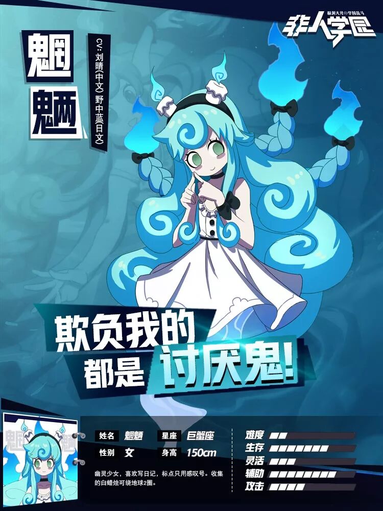 魍魉: 女,年龄未知,是一只货真价实的幽灵少女。 模样可爱乖巧,实则调皮捣蛋;对喜欢的人和不喜欢的人有截然不同的态度。有收集癖。写日记会用一大堆感叹号。