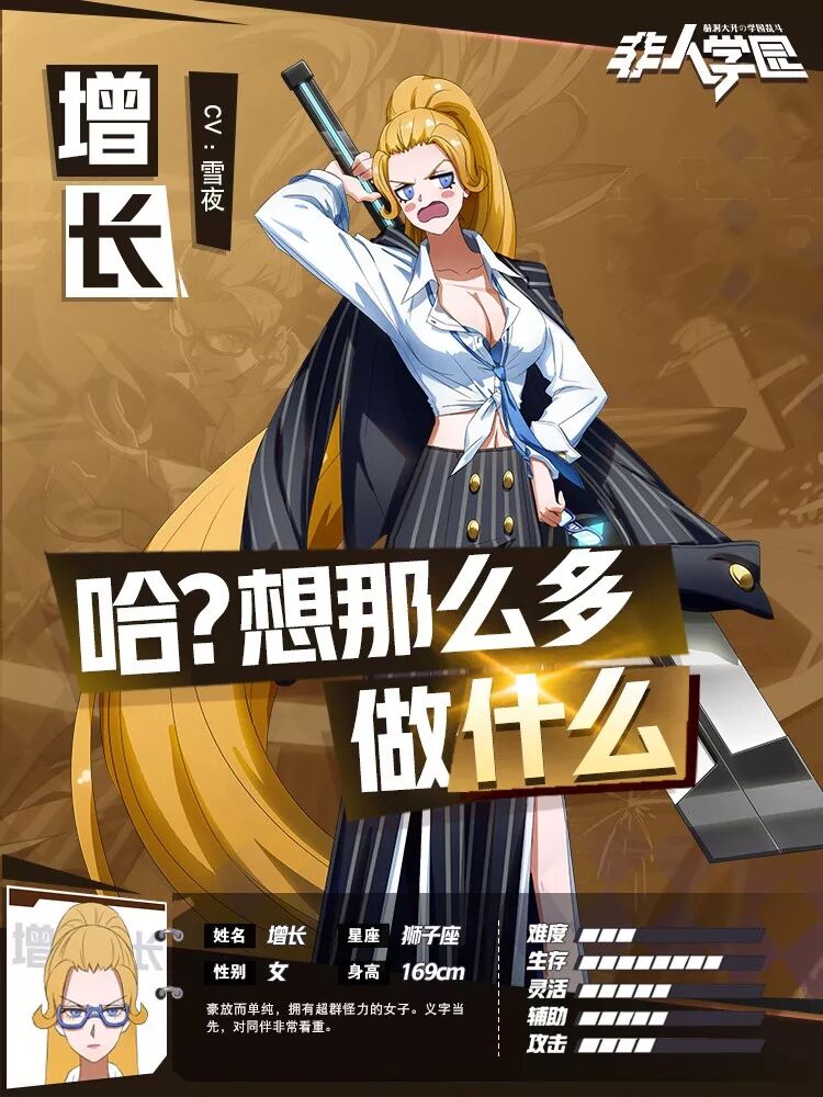 「增长」 及其时装, 将在 7月18日(周三)游戏更新后, 正式上架学园商城。 童颜、马尾、一身让敌人胆寒的天生怪力,生动为你解释“人不可貌相”的精髓。今天,雷雷一如既往地带你抢先一睹人设、技能~
