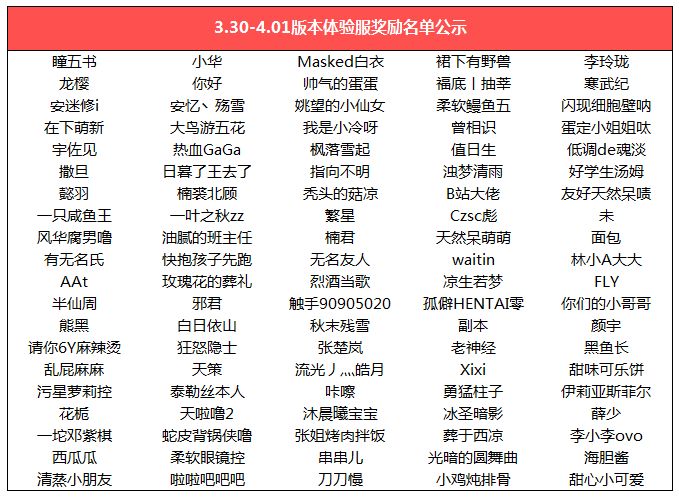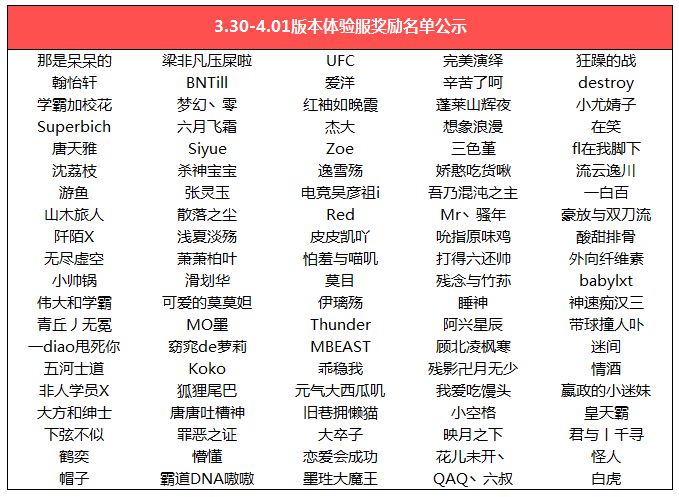 【体验服】3.30-4.1版本奖励、反馈采纳、数据报告公示
