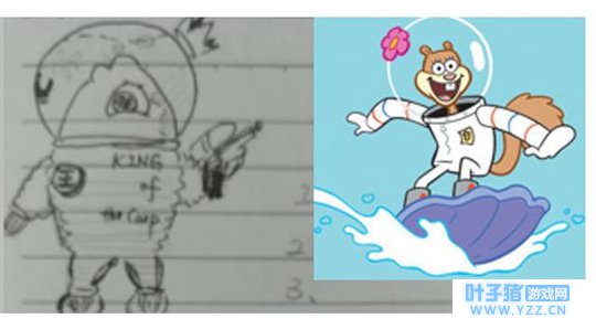 【当时立刻画下的草稿,灵感来自于松鼠珊迪】 小编:妙啊!那在技能特点上灵感有何独特之处? 老王:确定外形的同时,确定了一套专属于它的滑水玩法。简直跟这个角色完美相符。 "灵感位于地表和水下完全是不一样的形态,在一个机动力低但是伤害高的小短手和机动性超高伤害一般的咸鱼之间切换的时机决定了他的战场作用。 线上射手模式:在拥有大招的情况下控制住敌人并迅速打出输出,没事做的时候可以潜在水下滑滑水。”(啊,把战场定位都告诉你们了,快给我飞机游艇刷起来!)继承了老咸鱼王的特点,并有了外形服装和独特技能体系的参考,阿翔大佬将他对于这条鱼的喜爱一股脑地全部倾倒了出来。 小编:给老王和翔神疯狂打电话! 老王:以下是咸鱼王的演变过程