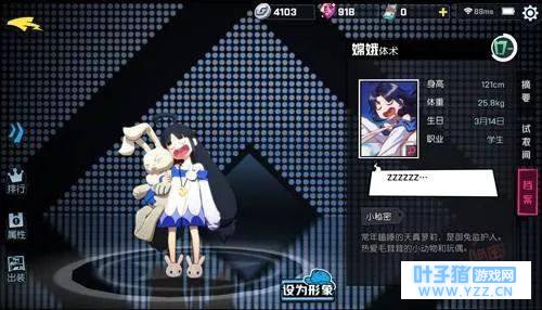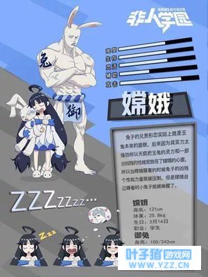 上图就是我们的嫦娥本尊。身高:121;体重:25.8kg;生日:3.14;职业:学生。这位年仅11岁的嫦娥妹妹最大的特点就是却常年瞌睡,作为御兔的监护人,对毛茸茸的小动物和玩偶十分热爱。