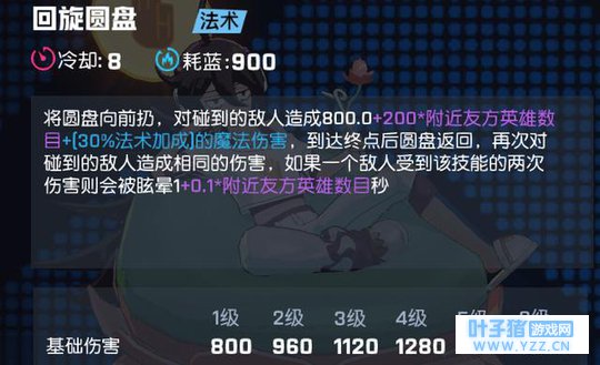 回旋圆盘:命中2段会有一个眩晕.这个技能伤害是真的不怎么样,就算5个队友都在也不怎么样.重要的是眩晕时间.队友越多时间越长...