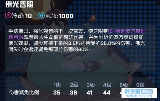 佛光普照:这个技能呢,那个附加的伤害也几乎几乎可以无视... 重要的是给右方附加的减伤.虽然BUFF结束后还是会返还80%的伤害, 也就是说100点伤害减少35BUFF结束后在受到30的伤害. 这个技能就是防止队友被秒 和 配合大招加血用的. 有意思的是被返还伤害弄死不算对面的人头...