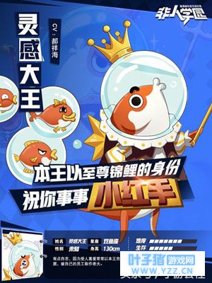 但是在魔性二次元的非都里,这个灵感大王可不一样,有一座神奇的蓝宫水族馆。而水族馆的馆长居然是一条锦鲤?!(OH 不,咸鱼?) 灵感大王作为蓝宫水族馆馆长、明星锦鲤、海洋保护协会的荣誉理事,有点自恋。因为受人喜爱,生活中常常以本王自居。是水族馆里为数不多有陆地生活经验的人,被自己的员工称作老大,仅凭自己的喜好行事。所以可见,他还是挺招人喜欢的,不过具体这个灵感大王到底是个什么角色,会以什么方式出现在《非人学园》中,目前还没有官方准确的消息,我们还是拭目以待吧! |