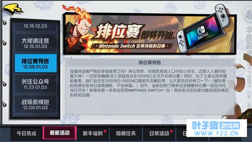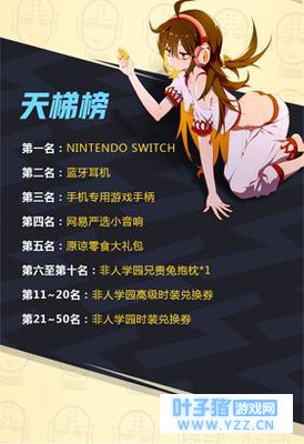 排位赛也有奖励哦! 全新的排位赛榜单在12月15日已经开启!在2017年12月15日到2018年1月3日的测试中,在《非人学园》非人学园天梯帮获取特定名次的玩家,都有机会获取实体奖励!新榜单的第一名将会获得NINTENDO SWITCH一台!另外还有蓝牙耳机,游戏手柄和非人周边可以获取哦!各位肝帝们!登录游戏,请开始你的表演吧!