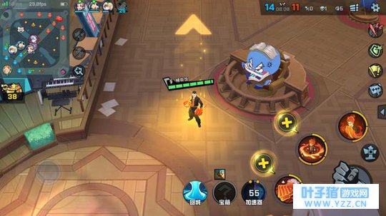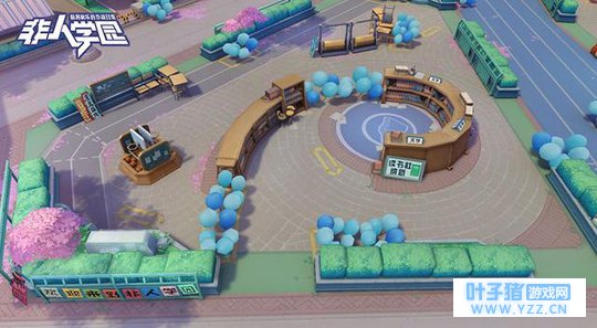 角色之外的丰富包装《非人学园》在角色之外的包装也很亮眼。和名字相同,游戏5v5的战斗地图就是一座正在举办庆典的学园,MOBA中的河道变成了操场跑道,草丛被设计成了气球堆,而红蓝Buff分别坐落在健身社和读书社中央: