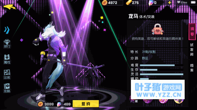 游戏中龙马的定位是一位野区英雄,擅长冲刺和收割(果然是种族优势,就是跑得快233)。龙马技能很符合他这个自恋歌星的形象,天马行空,横冲直撞毫无顾忌~