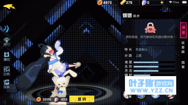 嫦娥在上的时候以自己的兔子玩偶作为武器进行攻击。不但可以突进对敌人造成减速效果,还可以在技能命中敌人是回复自身血量。 开启大招后嫦娥会进入沉睡状态,然后御兔将会觉醒。觉醒的御兔跳至目标范围击飞敌人,并且每一次技能命中都会减少大招的CD1S。 Emmm...这个小萝莉简直不要太暴力!嫦娥技能的特性让她在上路的对线中具备了不俗的消耗和回复能力,即使是面对敌方队友的gank也同样可以全身而退。