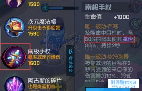 进游戏后,装备也需要注意一下 因为是走法术路线,装备当然要从物理换成法强了,其中最重要的一件装备就是南极手杖,因为它的减速配合被动双减速,减到对面怀疑人生!