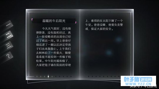 滑动书页可以翻阅日记 音乐无疑是该作优秀氛围的最大功臣,11首配乐个个都是精品,很适合静下心细细品味一番。游戏还贴心得设置了没有障碍的“禅”模式,只要通关剧情或是花6元就能解锁。 干净的UI,简单的操作,略带科技感的简约画面,以及无可挑剔的音乐,整个游戏被称为艺术品也不为过。