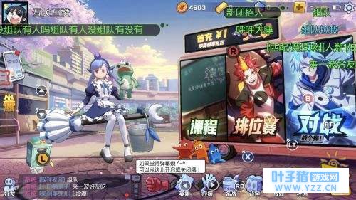 进入游戏后我们可以见到这个主界面也是很有特色,现实一台面包车开过来,停车后变成了右边的【课程】、【排位赛】、【对战】三个功能键。 设成形象的英雄,同时也会出现在这里,必能进行互动。最有意思的是界面上玩家所发的信息还会以弹幕形式出现。
