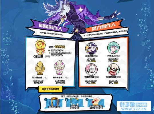 丰厚奖金奖品 等你C位出道 7月27日,将正式公布得分最高的5个角色设计,设计者将成为非人学园的【明星制作人】。综合得分最高的角色,将摘得“C位出道奖”,赢取6666元奖金,且该角色将优先植入游戏,英雄上线后,制作人和粉丝团还能免费获得该英雄!综合打分2-5名中,实力值占比高的2位将获得“实力派出道奖”,偶像值占比高的2位则获得“偶像派出道奖”,奖金各2333元,角色也将植入游戏! 除明星制作人外,其他参赛同学还能获得【潜力制作人】奖,分别获得666元奖金。具体奖项包括了人气最高的“流量大咖”1位,脑洞逗趣的“有趣的灵魂”3位,美就完事了的“好看的皮囊”3位,还有由雷雷投色子决定的“天选之人”! 而在华丽丽的头衔和奖金奖励之外,制作人还都将获得实物周边大礼盒、限定头像框,以及由行业大佬亲自指导的参与游戏策划开发的机会!在投票阶段,为制作人增加人气大于10次,还能成为制作人粉丝团的一员,有机会雨露均沾,记得为你心目中的大神投票喔!