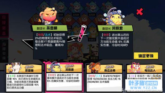 应援团推荐 团长飞机头【物理】: 5秒内连续三次普攻命中后,则下次普攻被强化,造成额外(50+40%额外物理加成)的真实伤害;远程英雄获得一半的额外伤害和射程+25%。 副团长河豚君【物理】: 进出草丛后的下一次普攻额外造成对方当前生命值5%的真实伤害,冷却8秒。 副团长芭蕾喵【生存】: 击败敌方英雄时,立即回复15%已损生命值和魔法值。协助击杀敌人或者防御塔时立即回复15%已损魔法值。 蓝色团员:沙漏妹*5 冷却缩减+8% 红色团员:持剑男*5 攻击力+26 绿色团员:拔子汪*5 物理吸血+9%