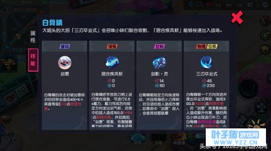 技能介绍及解析 被动:剑意 白骨精的攻击对被剑意标识的目标会造成40(+5×英雄等级)(+20%额外物理加成)点物理伤害。 一技能:居合疾风斩 白骨精把手放到刀柄上进行居合准备,可进行2.5s蓄力,蓄力完成后向指定方向发出剑气斩,对命中的敌人造成物理伤害,并且施加“剑意”效果,伤害随着蓄力时间提升,最多可提升至1.75倍,在1.5s后达到最大值。施加被动的主要技能,命中后可以提升白骨精的伤害以及二技能的眩晕控制。 二技能:剑影·灵 白骨精朝指定方向快速移动,并且用身后小刀挥斩,对沿途的敌人造成伤害,如果命中“剑意”敌人,会使其短暂眩晕,这是白骨精的唯一控制技能。 大招:三刃卒业式 白骨精朝一个方向突进并使出卒业式挥砍,造成大量物理伤害,对“剑意”效果影响敌人造成额外伤害,随后两位小妹出现进行补刀,对白骨精身后的区域造成60/80/100/120 (+50%物理加成)点物理伤害,小妹的补刀还会造成目标30%已损失生命值的物理伤害。 觉醒: 三刃卒业式命中“剑意”效果影响的目标会刷新“居合疾风斩”和“剑影·灵”的冷却时间。