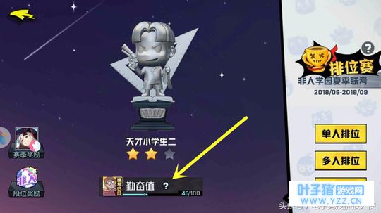 《非人学园》也有排位赛,不过要7级的时候才能进行排位,初始情况下对所拥有英雄的数量没有要求限制。《非人学园》一共有6个段位,分别是:无敌幼儿园、天才小学生、神奇初中生、耐撕高中生、超绝大学生、学园传说。而所有进入学园传说段位的玩家,会根据星星数量进行全服排名。勤奋值其实就是保级使用的,但如果勤奋值满了以后,就会增加一颗星星。因为刚公测的原因,所以现在去打排位上分的话,应该是非常容易的。