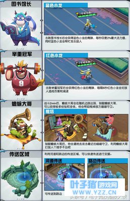 其他位置的英雄正常对线就可以了,但打野一定要掌握地图上的野怪种类。野区的小型野怪没有任何增加属性的作用,但下面的这些是绝对要了解和给予重视的。击败图书馆长后可以获得蓝色小龙,每秒回复2%最大法力值,同时蓝色小龙会帮忙攻击敌人。击败举重冠军会获得红色小龙,每隔5秒红色小龙会对敌人造成伤害和减速。蟾蜍大哥会随机出现在边路,驯服蟾蜍大哥后,可以获得较多经验和金钱,他会帮助推掉敌方防御塔。在后期,河道中会出现大喵,击败大喵后会将其收服,随后大喵会帮助队友一起推塔,大喵非常强势所以需要更多人去合力将其击杀。而边路、河道会有互通的传送口,这样可以更快速进行支援。