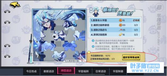 另外,学园男神银角的拼图活动要在7月6号前完成!要是来不及做任务的小伙伴可以邀请朋友帮你点亮,一天最多能点亮2片,加上自己游戏任务得到的四片,最多只要5天时间~免费领取帅哥回家的机会小编表示错过就是一大遗憾,想要签约这位高冷男神的小伙伴可要加油做任务,到时候他会替你收拾各种"烂摊子"的,emmm,大概吧……