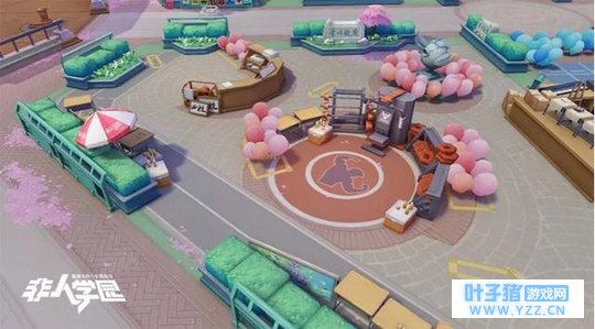 在地图上《非人学园》巧妙的将日系校园二次元元素与MOBA地图玩法结合,在地图上融入了许多的校园元素。如课桌、书本、书架等,传统MOBA手游中的草丛也变为了粉色蓝色的气球,河道变成了跑道。战场中还随处可见各类学园活动的宣传横幅,就连基地都变成了学生动员大会的发言台。