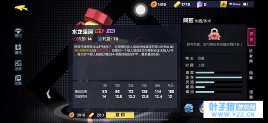 【1技能:重锤水花】 阿蛟抬起大锤跳向目标,对目标和周围敌人造成200.0(+80%物理加成)(+1.5%最大生命值)点物理伤害,减速敌方英雄20%,持续3秒。 这个技能是有一定的位移效果的,阿蛟可以用来追击敌人或者逃脱。