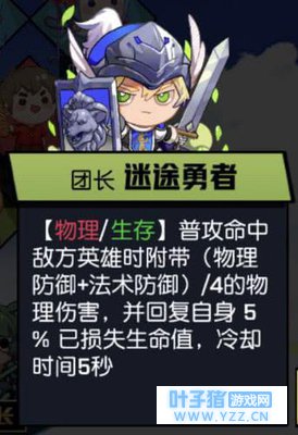 应援团的搭配方面上: 团长-迷途勇者: 普攻命中敌方英雄时附带(物理防御+法术防御)/4的物理伤害,并回复自身5%已损失生命值,冷却时间5秒。 红孩儿作为近战英雄,操作失误很容易“以命换命”,团长的技能不仅提升了红孩儿的物理输出,还保障了红孩儿的生存能力