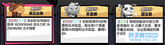 副团长-南瓜法师+茶壶精 :南瓜法师能让红孩儿在4/8/12/16级时获得10/20/30/40攻击力,而茶壶精能在初始使红孩儿获得2%的物理吸血,每击败一个英雄提高1%物理吸血,最高10%。 选择这两位副团长也是和团长一个道理,让红孩儿输出的同时保护自己,当然除了这两位,大家也可以选择国宝君,在释放技能命中后增加10点最大生命,最多叠加40层,满层后额外增加200点生命值,保命能力更强,但没有输出上的加成。