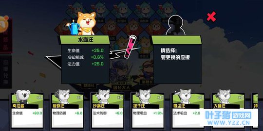 绿色应援队 水壶汪:生命值+25,冷却缩减+0.6%,法力值+25 水壶汪可以为英雄带来生命值、法力值以及冷却缩减的提升,生命值能够加强英雄的肉度,法力值可以加强英雄的技能释放次数,最后的冷却缩减可以提升英雄的技能释放频率,每条属性对于辅助类英雄来说都是非常实用的。
