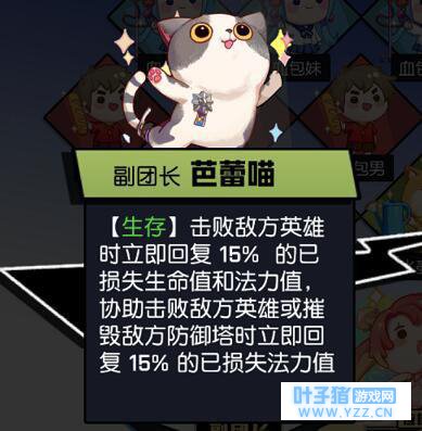副团长一:芭蕾喵 击杀敌人时立刻回复10%已损失生命值和魔法值,协助击杀时立刻回复5%已损失生命值和魔法值。 在击败敌人时,立即恢复一定比例的已损失生命值和魔法值,这就在一定程度上增加了突袭英雄的生存能力。同时,在一些极限情况下,可能还会有意想不到的惊喜,对突袭英雄非常有利。