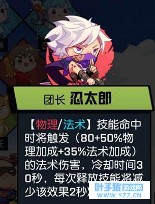 首先是我们应援团里的团长们,小编推荐的是【忍太郎】+【芭蕾喵】+【伏地魔】 团长忍太郎 技能命中时将触发(80+50%物理加成+35%法术加成)的法术伤害,冷却时间30秒,每次释放技能将减少该效果2秒冷却时间。而且近战攻击敌人背部会附带(600+30%攻击力)的物理伤害。忍太郎不仅能提供物理伤害和法术伤害,小编觉得有了忍太郎,在于敌人交战时,每个技能冷却时间还能降到2秒,已经是很可观了,再也不用担心技能放完了,没招可放。