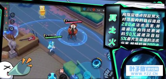 冥之火:魍魉向指定地点投掷冥火,对范围内的目标造成280/336/392/448/504/560点法术伤害,并造成1秒内持续衰减的90%减速及目标5%最大生命值的法术伤害,魍魉的每200点法强都可以让这个比例再增加1%。