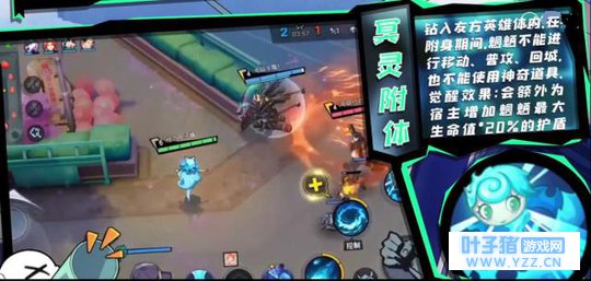 冥灵附体:魍魉化为冥火,钻入友方英雄体内。在附身期间,魍魉不能进行移动、普攻、回城,也不能使用神奇道具。觉醒效果:会额外为宿主增加魍魉最大生命值*20%的护盾。