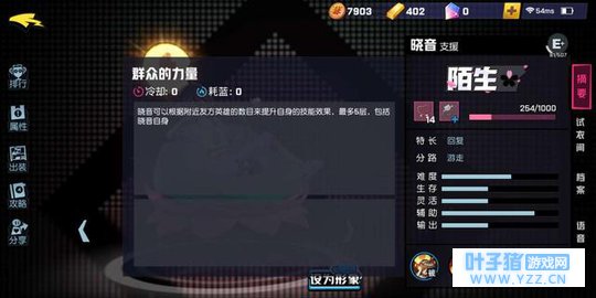 晓音在《非人学园》中的定位是支援,她有控有奶有减伤,技能比较全面,但是缺乏位移,所以也不能离开队友的保护,我主要从 技能、出装、应援团和打法 4个方面来作一简单解析。 【技能介绍】 1. 被动技能:群众的力量 晓音可以根据附近友方英雄的数目来提升自身的技能效果,最多5层,包括晓音自身。晓音的被动可以看出她虽然是个法坦/法辅,但可以不是很依赖出法强件,晓音的被动技能比较依赖队友,所以跟团时需要队友的配合。