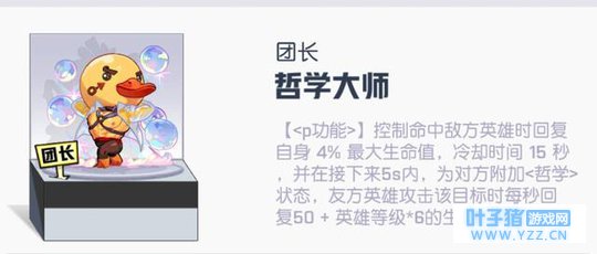 生命值和冷缩的加成,能提高生存能力,加强二技能伤害,并让晓音的技能冷却快一点,增加法强目的是为了提高晓音的前期技能伤害。 团长和副团长推荐选择 哲学大师+芭蕾喵+国宝君 。 哲学大师: 控制命中敌方英雄时回复自身4%最大生命值,冷却时间15秒,并在接下来5s内为对方附加"哲学"状态,友方英雄攻击该目标时每秒回复50+英雄等级*6的生命值。