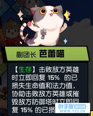 芭蕾喵: 击败敌方英雄时立即回复15%的已损失生命值和法力值,协助击败敌方英雄或摧毁敌方防御塔时立即回复15%的已损失法力值,可以有效增加晓音回血回蓝的能力。