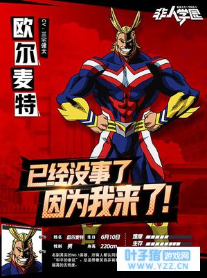 除了细致入微的刻画还原,更有忠实于原作的技能设计,那些你耳熟能详的招式名,也将在学园战场上充分体现欧尔麦特的坚毅与魅力! NO.1英雄!一往无前的One for All! 在《我的英雄学院》中,大部分的人类拥有名为“个性”的力量,有人因之进行破坏,而以欧尔麦特为代表的英雄们则挺身而出,守护正义与和平。作为一个原本没有个性的普通人,欧尔麦特经过了刻苦修炼,继承了One for All的力量,将众多人份的极限身体能力收束于一身,可以造成巨大破坏的冲击或肉眼难以捕捉的高速移动。