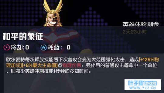在职业技能方面,无不彰显着作为力量存在的特征;欧尔麦特以【体术】职业现身《非人学园》的战场上,战斗方式高度忠实于原作。 【被动技能-和平的象征】 欧尔麦特一旦使用这个技能后,特殊的普攻"Smash"就能完全的施展出来;遇到敌人时,攻击距离以及攻击范围就会增大。