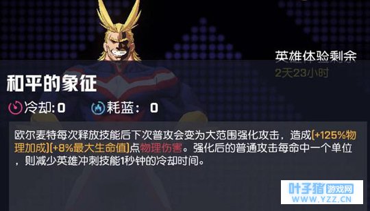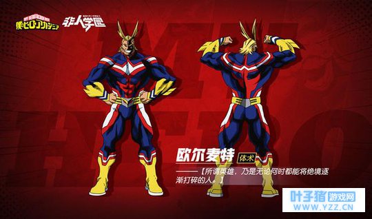 欧尔麦特是一个具有强大信念、担当、责任的灵魂人物,在《非人学园》中以【体术】现身无可厚非。他的战斗方式和技能也是向原作高度致敬,被动技能【和平的象征】更是可以让他特殊的普攻"Smash",施展出更大的攻击范围。