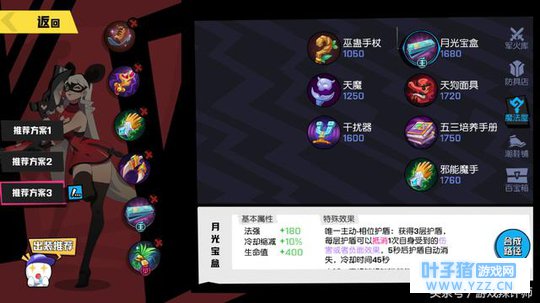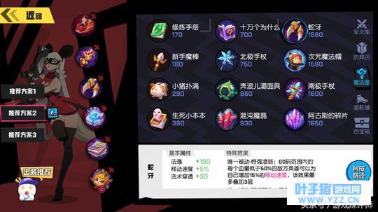 (出装2) 说明:笔者注意到有些高玩喜欢带攻速鞋,其实也是可以的,但是必要的法穿还是要出的,这里强烈推荐蛇牙,其他属性先不说,它的被动之一就是根据自身移速增加法强(别忘了白灵的被动~)。 3.牛津鞋+严选法杖+邪能魔手+蛇牙+月光宝盒+救命稻草