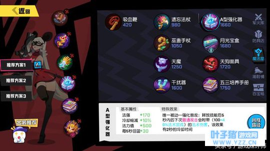 (出装1) 说明:这套出装比较均衡,伤害、续航、生命值、冷却等都顾及到了,重点说说两个装备。邪能魔手,简直就是为白灵量身定做的装备,法强、攻速、冷却、普攻强化都是白灵需要的属性。A型强化器,个人比较喜欢的白灵配装,法强、冷却、法力值、回蓝,最重要的是它的被动可以和邪能魔手搭配使用,轻松打出高爆发伤害。 2.暴走鞋+严选法杖+蛇牙+ A型强化器+五三培养手册+大圣面具