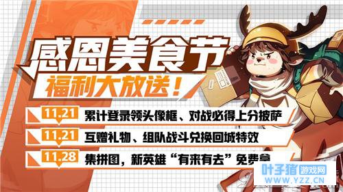 美食大赏 新英雄闪亮登场,感恩节丰富的节日活动也将于11月21日至12月11日福利开启。感恩节当天(11月22日)首次登录,可获得感恩节商城随机时装打折券礼盒!累计登录7日,还能领取感恩节主题【头像框·美食节】。