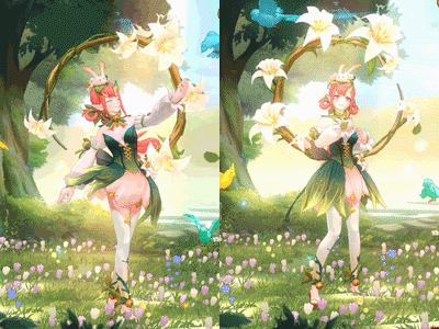 肆季花仙子时装 繁花翠木元气满满 赛季专属时装[花仙子],让肆季穿上了碧绿叶片和淡粉花瓣交织成的短裙,加上如百合花盛开的衣衫和笼袖,透着清爽可人的感觉。此外,粉色飘逸长发则让肆季元气感满满,而头上枝叶与花朵交织成的头饰,犹如蝴蝶蹁跹的脚部装饰,由枝条缠绕而成的金刚琢,更是全方位让宝具狂人变成了花草的精灵!